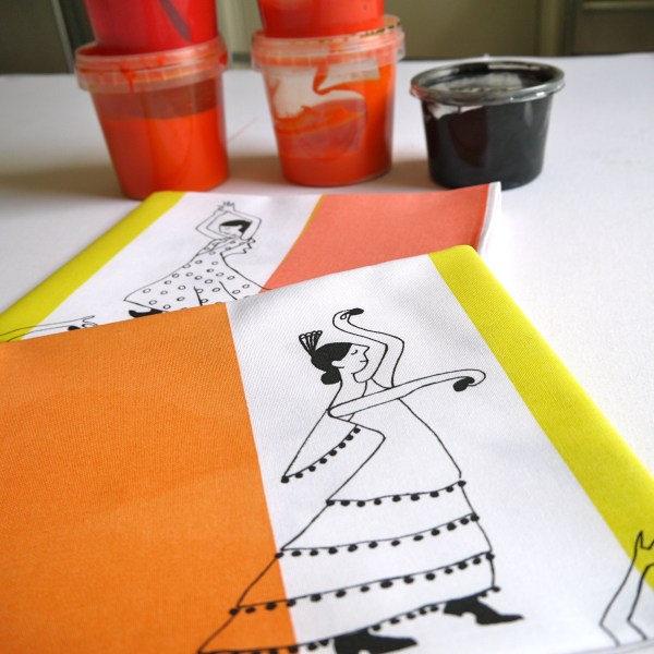 A pile of various teatowels ironed and ready Here are the Spanish Dancer teatowels – another version. Sun and Moon in grey and one blazing pink sun. A dessign of…